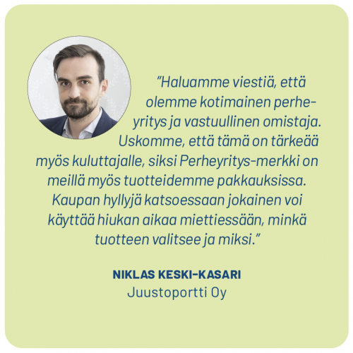 Suomalaiset perheyritykset kehittävät suomalaista osaamista ja pitävät maamme kilpailukykyisenä jatkossakin. Perheyritysten liitossa on 450 jäsenyritystä, joiden liikevaihto on 36 miljardia euroa ja jotka työllistävät noin 181 000 henkilöä. Olkaa ylpeästi suomalaisia perheyrityksiä ja kertokaa se myös asiakkaille, henkilöstölle ja muille sidosryhmille. Suomalainen perheyritys-merkki on siihen erinomainen keino. Kotimaisuus on kilpailuetu, jota kannattaa nostaa esiin.