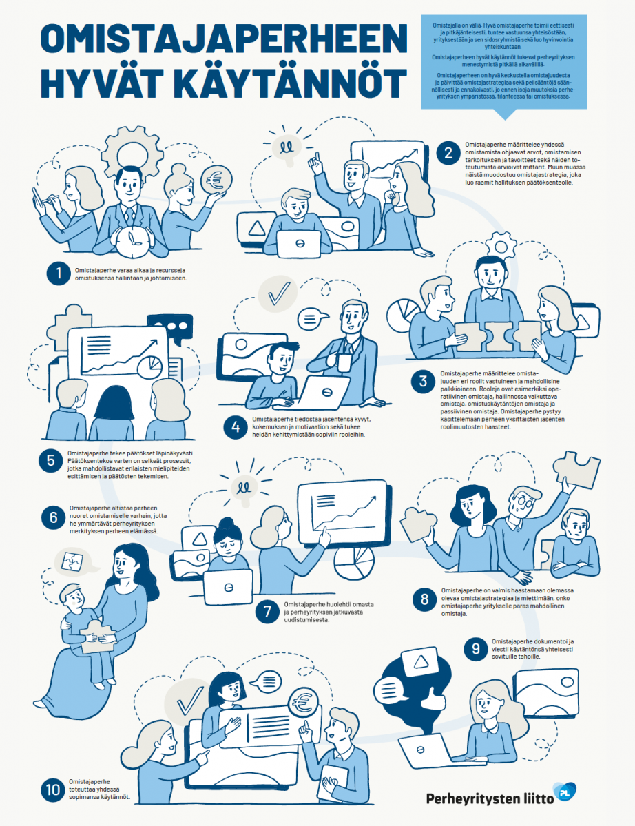- Omistajaperhe määrittelee yhdessä omistamista ohjaavat arvot, omistamisen tarkoituksen ja tavoitteet sekä näiden toteutumista arvioivat mittarit. Muun muassa näistä muodostuu omistajastrategia, joka luo raamit hallituksen päätöksenteolle.