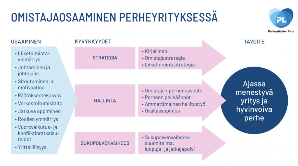 Omistajaosaaminen on kokonaisuus, joka yhdistää liiketoiminnan ymmärryksen, johtajuuden taidot ja kyvyn tehdä vaikuttavia päätöksiä. Keskeisiä omistajaperheen osaamisen alueita ovat sitoutuminen ja motivaatio, yritteliäisyys, verkostoitumistaidot sekä konfliktinratkaisukyky. Omistajalla tulee olla selkeä käsitys omista rooleistaan yrityksessä ja perheessä sekä halu jatkuvaan oppimiseen. Omistajan eri rooleissa tarvitaan erilaista osaamista. Myös perheyrityksen vaihe määrittää osaamistarpeita.