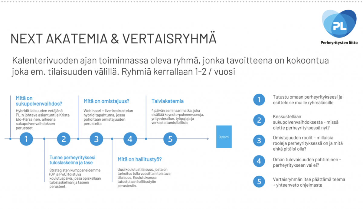Next Akatemia on valmennusohjelma, joka johdattelee peruskysymysten kautta perheyrittäjyyteen. Next Akatemia koostuu Nexteille suunnatuista perustason koulutustilaisuuksista, sekä koulutusten välille sijoittuvista ryhmätapaamisista. Tule mukaan ensimmäistä kertaa järjestettävään Next Akatemiaan!