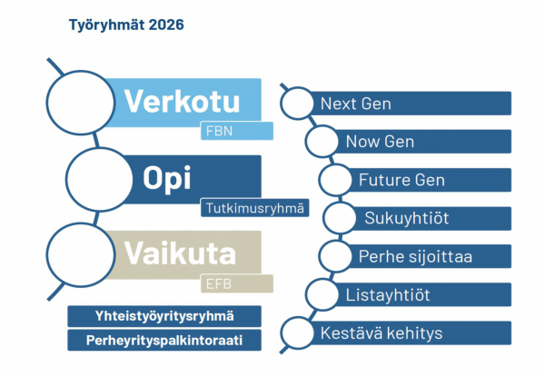 Perheyritysten liiton työryhmäpäivä 3.2. tarjosi katsauksen Perheyritysten liiton monipuoliseen työryhmätoimintaan ja vuoteen 2026. Työryhmät ovat keskeinen osa liiton strategiaa: ne tuovat jäsenten äänen liiton toimintaan, vahvistavat yhteisöllisyyttä ja tukevat liiton vaikuttamistyötä.